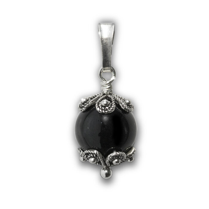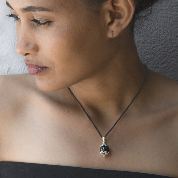 Il nostro Cocco, con pietra onice nera, è corredato di laccetto in caucciù e ha un diametro di 10 mm.