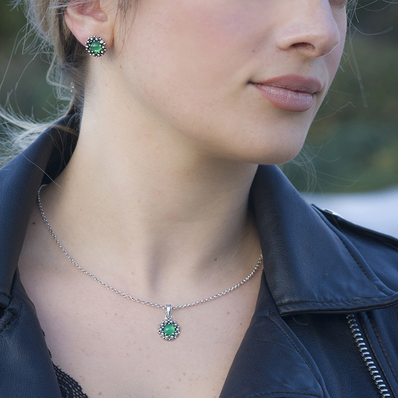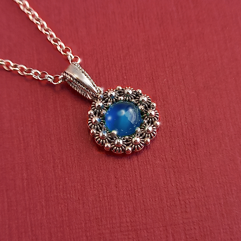 Il ciondolo è disponibile in quattro varianti: con pietra agata blu, agata verde, granato rosso e onice nera.