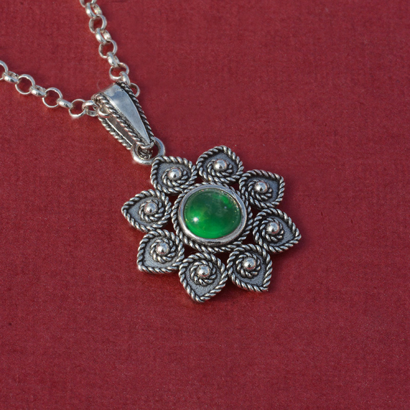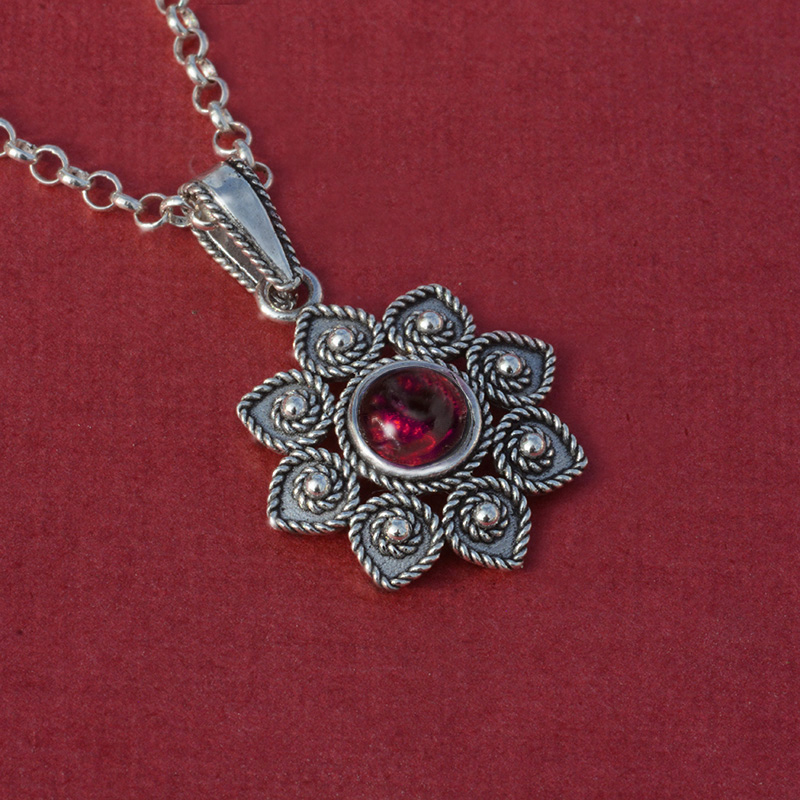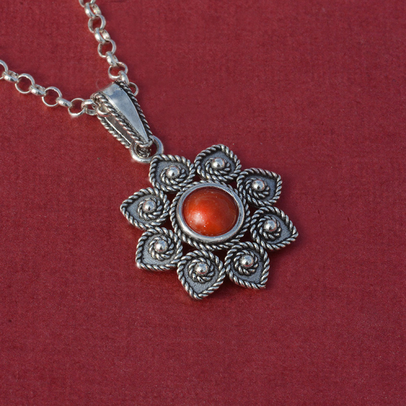Il ciondolo è disponibile in quattro varianti: corallo, pietra granato rosso scuro, agata blu e agata verde.