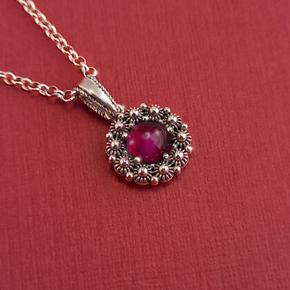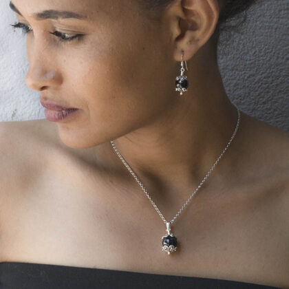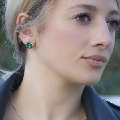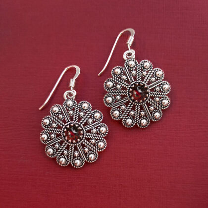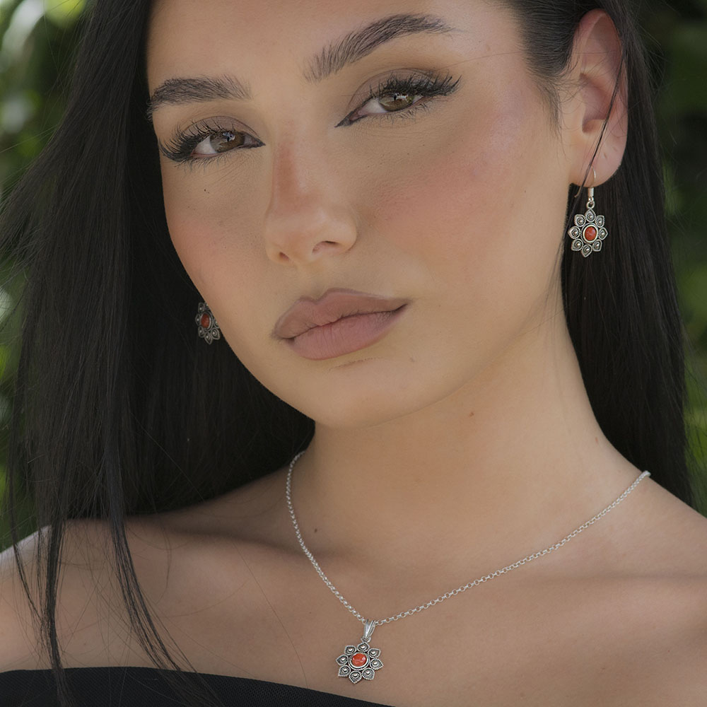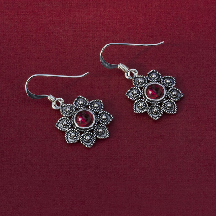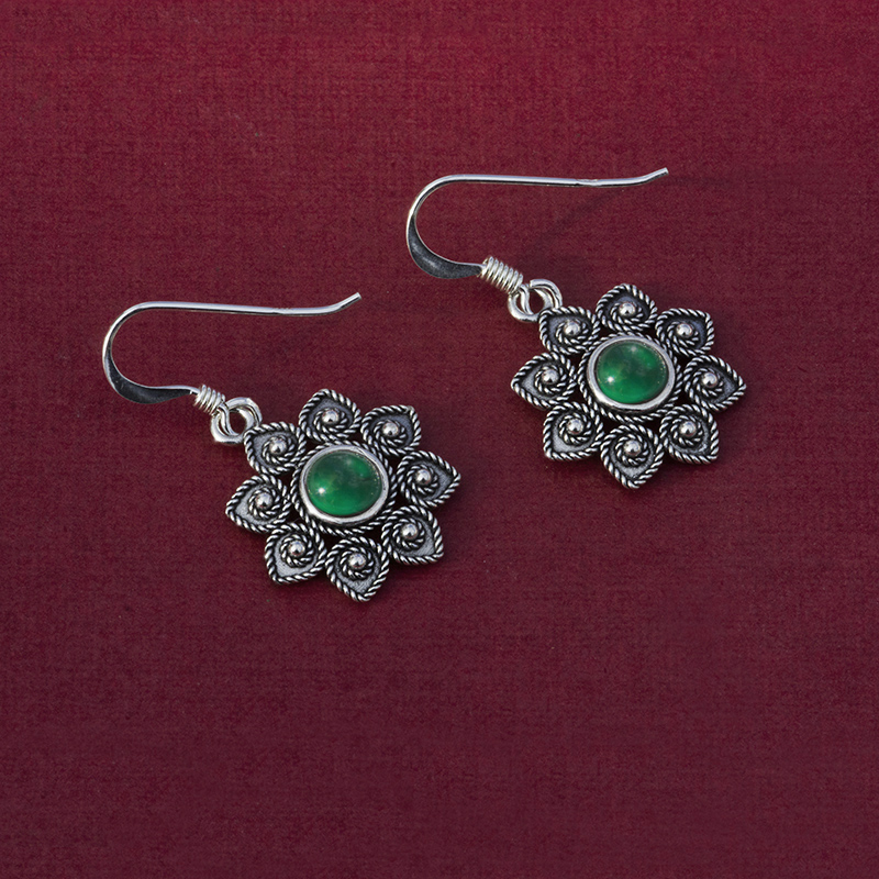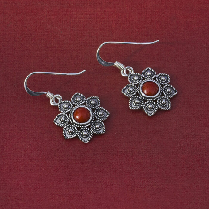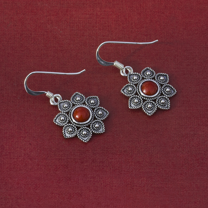 Gli orecchini sono disponibili in quattro varianti: corallo, pietra granato rosso scuro, agata blu e agata verde.